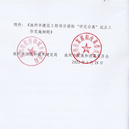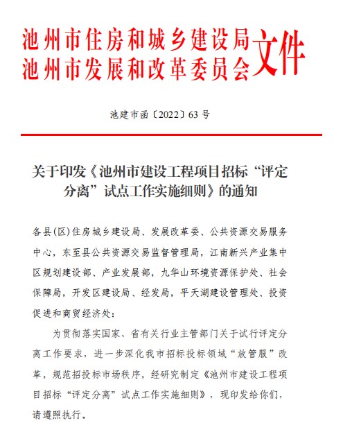 標題: 【市場主體反映工程建設項目審批問題的辦理和反饋機制】關于印發《池州市建設工程項目招標“評定分離”試點工作實施細則》的通知 文號: 池建市函〔2022〕63號