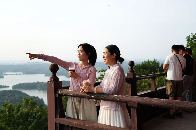 圖為游客在望華樓上,一邊品嘗咖啡,一邊欣賞平天湖湖光山色。