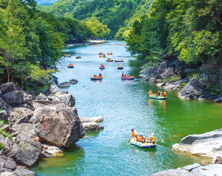 夏日的秋浦河沿岸,總能聽到此起彼伏的尖叫與歡笑。在石臺大峽谷漂流項目的起點,穿著救生衣的游客排起長隊,等待乘坐皮筏艇駛入重陽河的原生態河道。這段經科學改造的漂流路線,以高落差、多急彎著稱,皮筏艇在浪花中穿梭,既讓游客體驗到“速度與激情”,又能在青山環抱中感受清涼愜意。