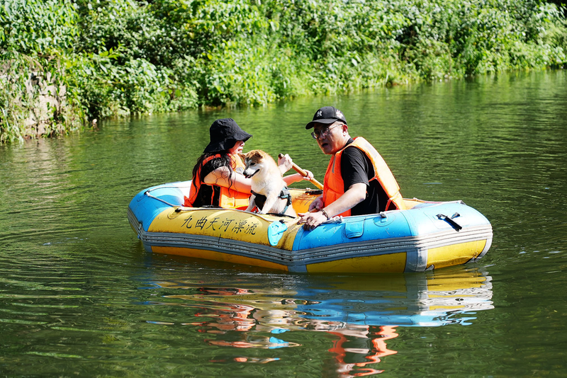 圖為游客攜寵物在朱備鎮九曲天河景區體驗生態漂流。通訊員徐成攝